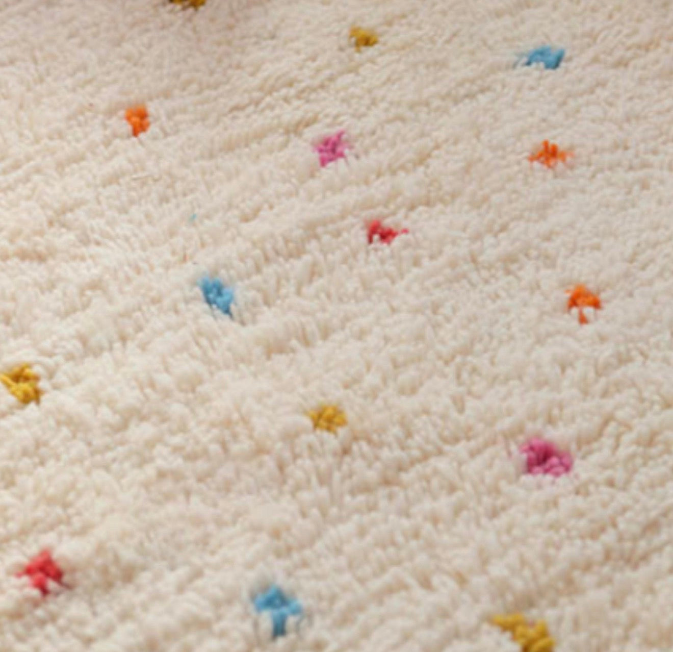 This rug features a cream base with multicolor dotted accents in pink, blue, orange, and green. Its design is both fun and modern, making it a favorite for nurseries, kids’ rooms, playrooms, or eclectic boho interiors.