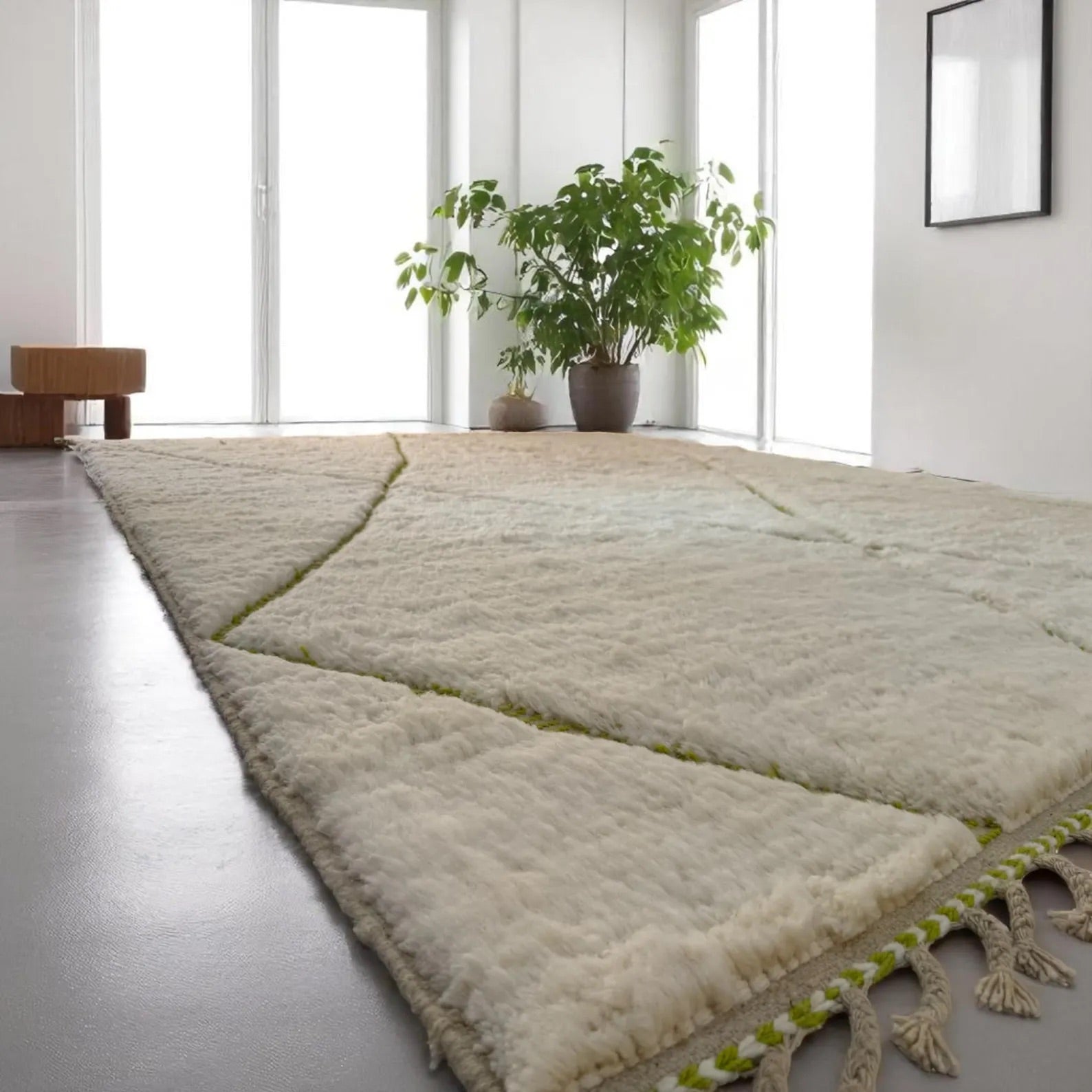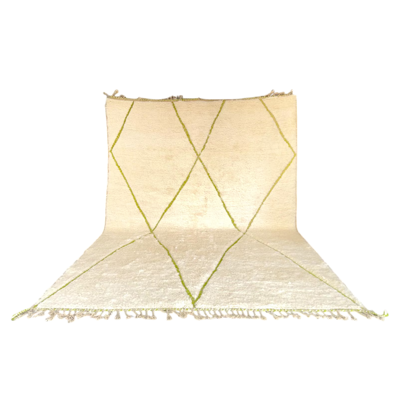 Bring serenity to your home with this white Moroccan Beni Ourain rug adorned with soft lime green diamond patterns. Woven from 100% natural wool, this rug reflects timeless Berber tradition reimagined for minimalist and Scandinavian-inspired interiors.